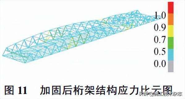 加固后,采用SAP2000对桥及导梁进行整体建模计算模拟,桁架杆件应力比均0.8(见图11),因此,在施工过程中桥体跨中腹杆失稳的风险点从理论上已经排除,但在实际施工中,还要对桁架应力进行密切监控。