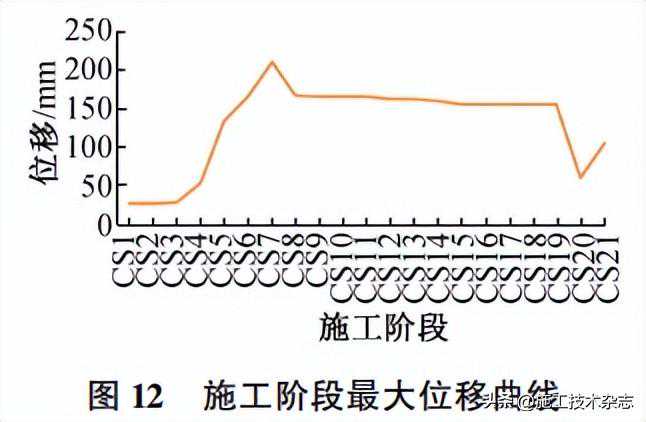 根据整个施工阶段模拟分析,在CS7~CS19施工阶段,出现较大竖向位移(见图12)。