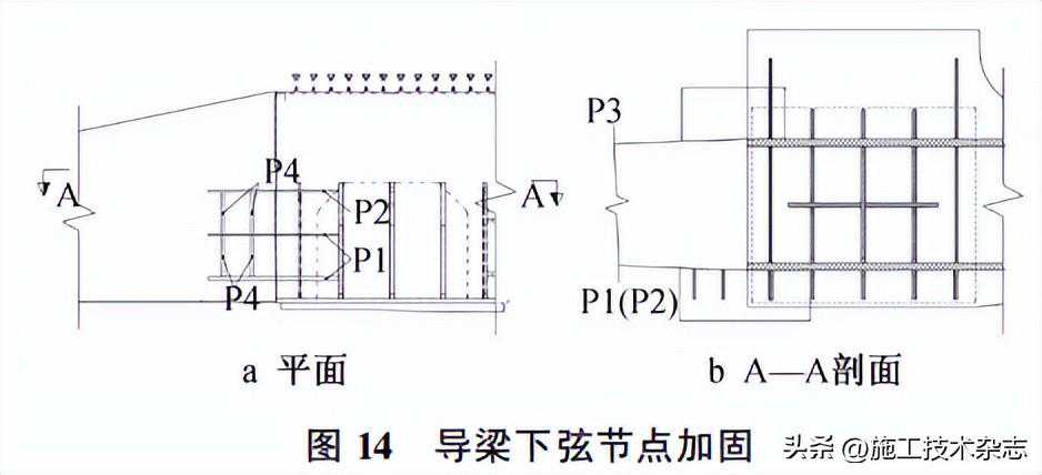 3)风险点化解钢导梁根部与钢桁架前端为应力集中区域,对其节点进行加强。现场采用30mm厚钢板对下弦连接焊缝进行加强(见图13),采用H700×300×13×24双拼型钢加强上弦连接焊缝(见图14,P1~P4为节点补强钢板,内厚30mm),通过在最不利工况前对不利节点的加固,保证施工过程安全。
