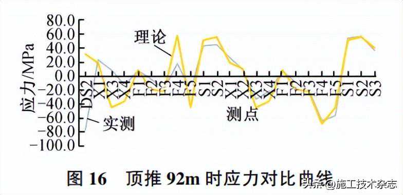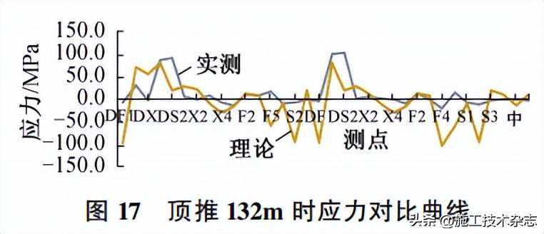 根据钢导梁应力监测数据分析可知,在顶推过程中,测点实测应力与理论应力接近(见图16,17),顶推过程中钢导梁应力基本处于可控状态。