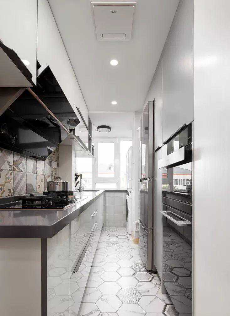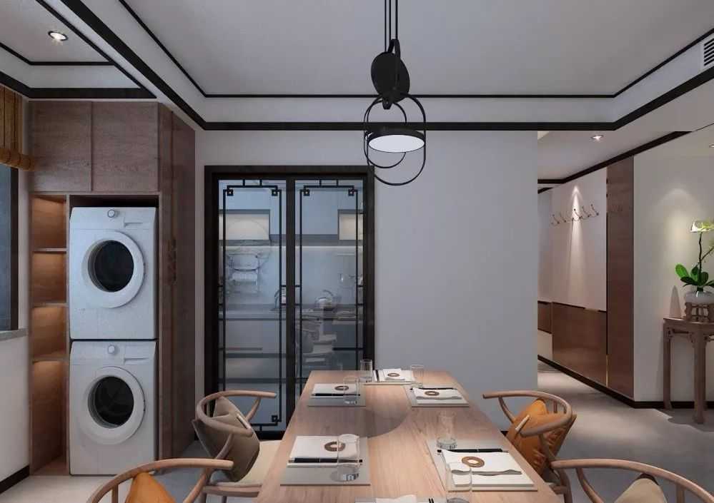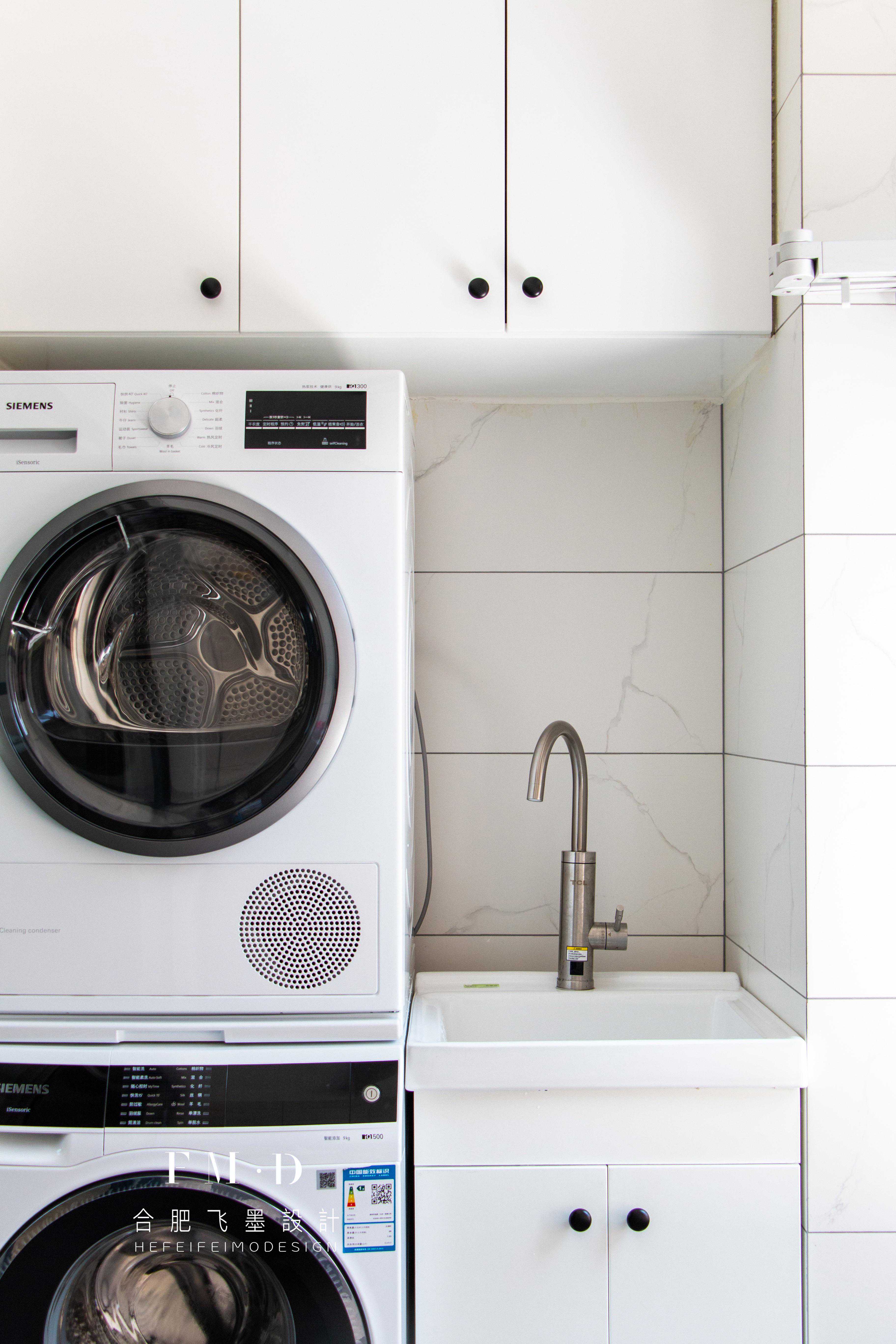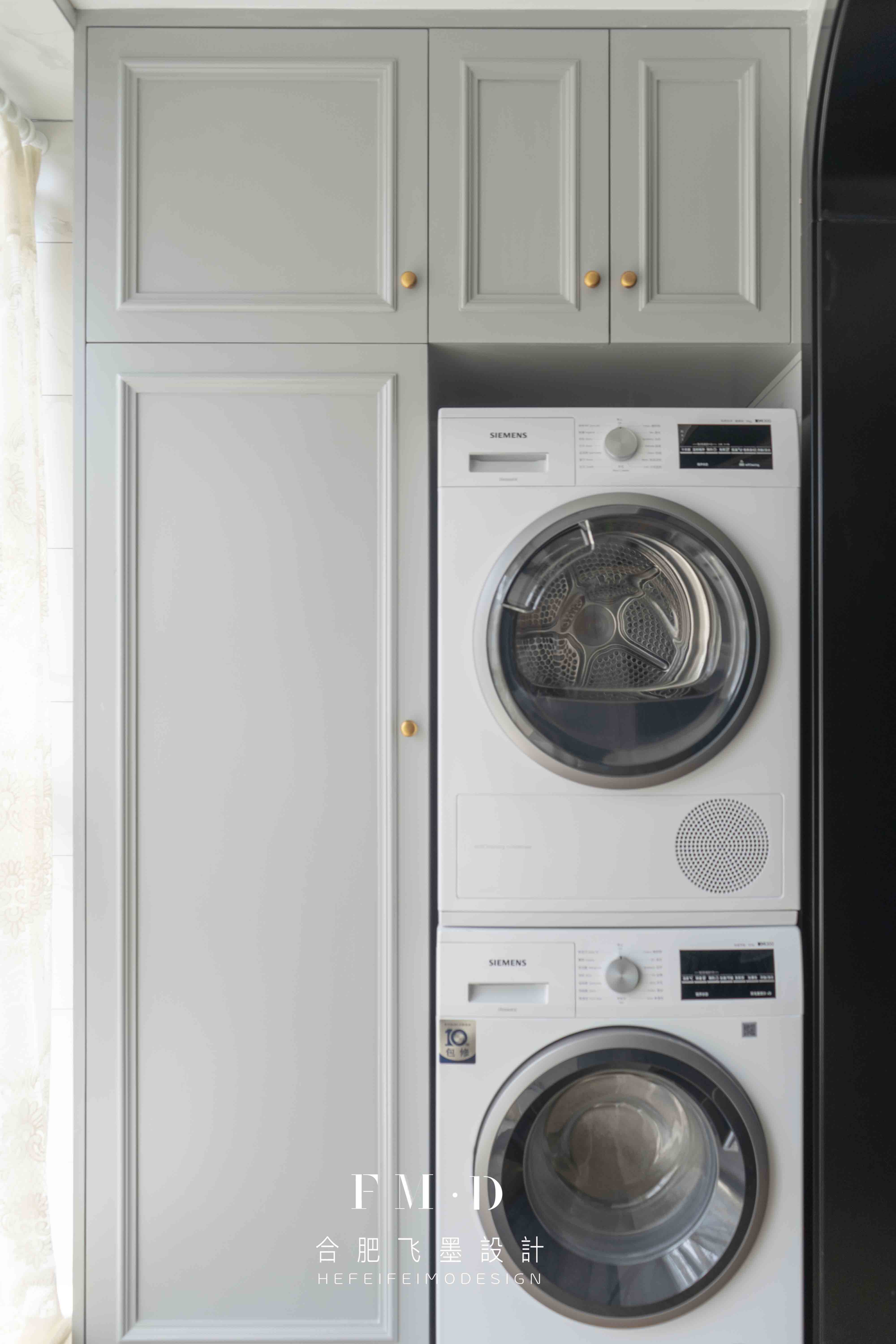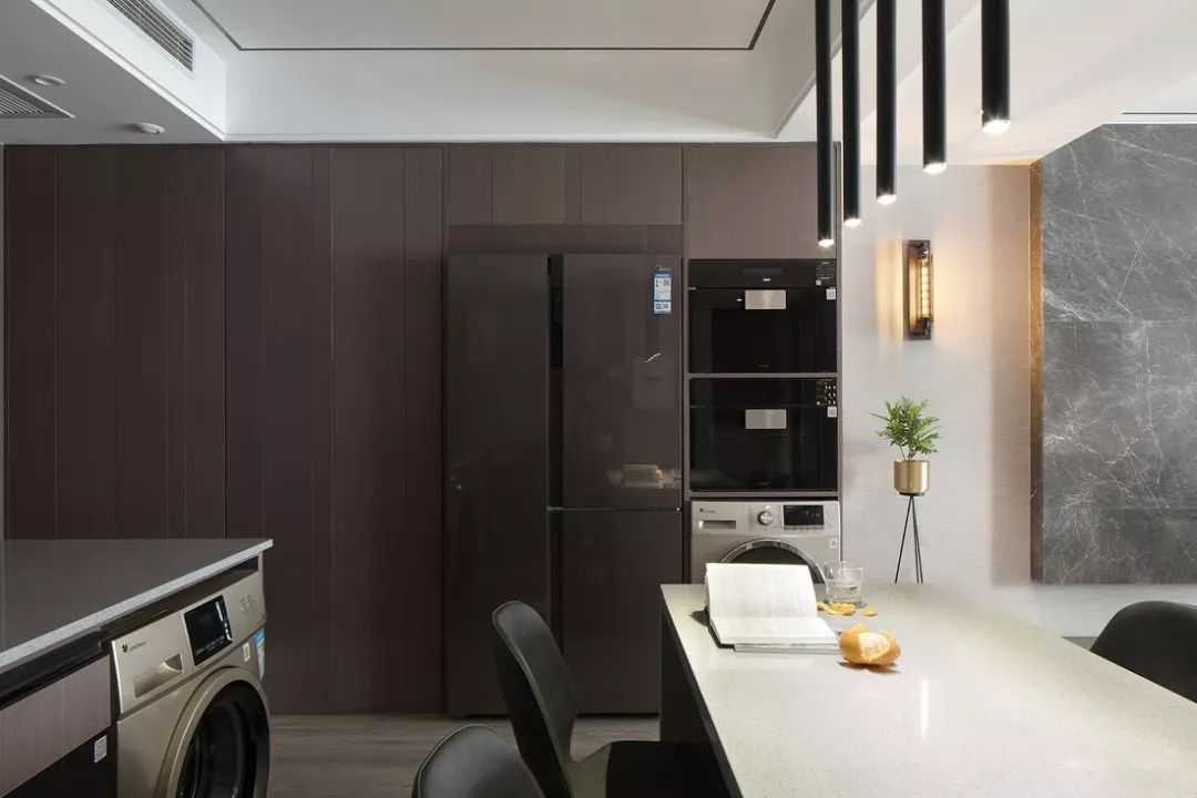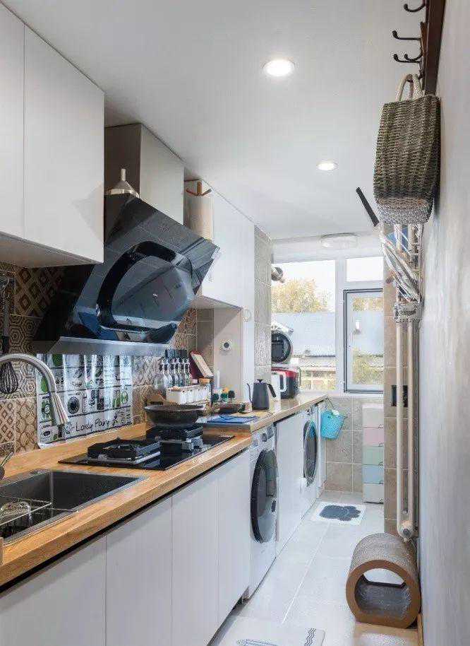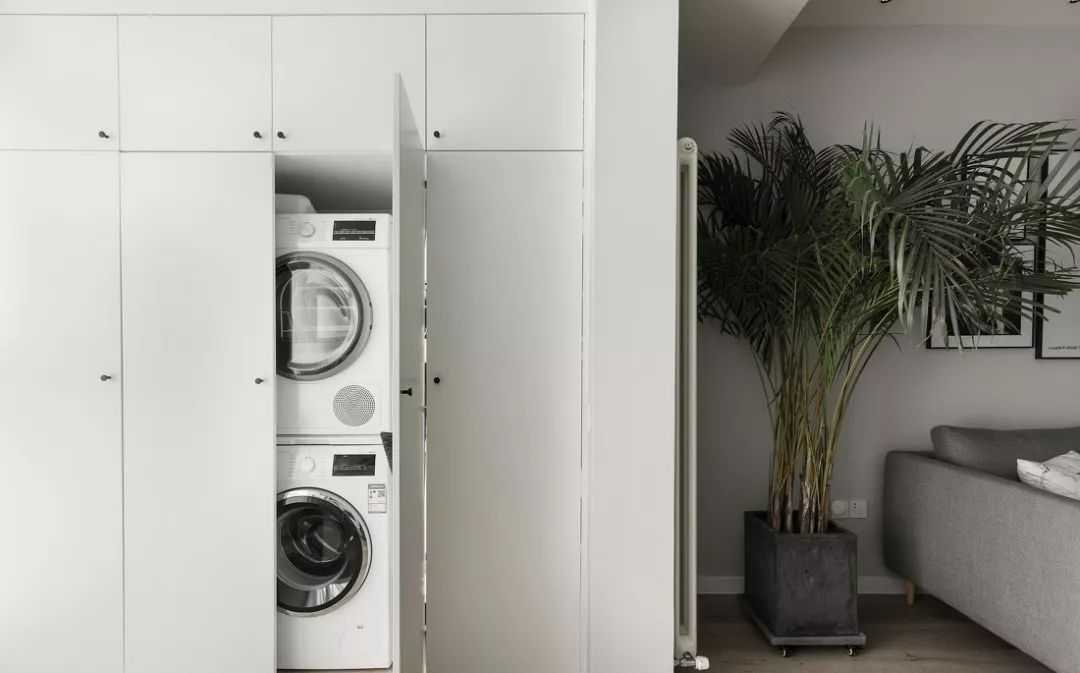 厨房有完整的上下水系统,因此将洗衣机和烘干机放在厨房也是很方便的。做橱柜的时候,直接在旁边预留好洗衣机和烘干机的尺寸既可。