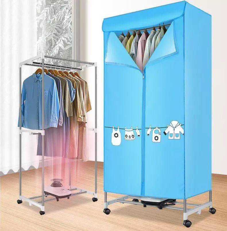 衣架式烘干机,简单来说,仿佛就是衣架外面套一层罩子,通过电热器加热空气,衣服上的湿气直接排出去。就像一个大型的吹风机,用热风吹干衣物。
