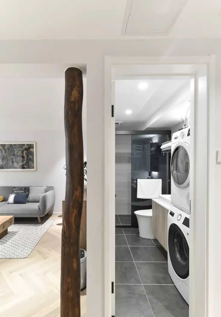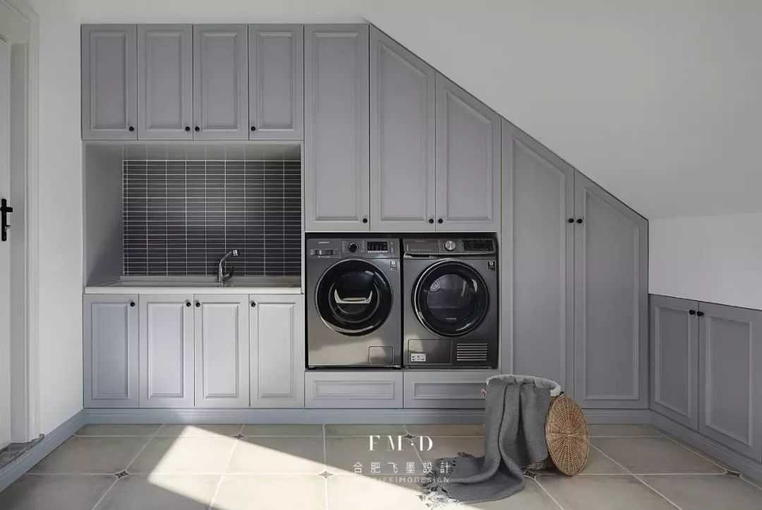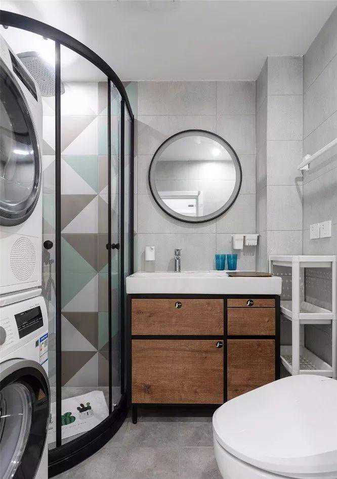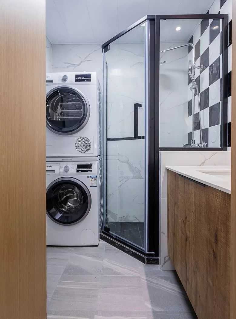 洗衣机烘干机放在卫生间也是常见的方式,毕竟这里有完整的上下水系统,也不用担心因洗衣机烘干机排水而地面漏水的情况。重要的是,每天洗澡时候直接把换洗衣物扔进洗衣机,省时省心省力。