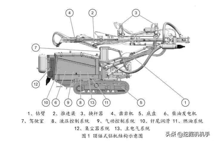 先来说说来顶锤式钻机的结构,它主要是由钻臂、钻杆推进粱、换杆器、凿岩机、液压控制系统、燃油系统、底盘、驾驶室等结构组成。其一般工作在需要钻孔爆破的石矿,在分割石材、开挖建筑基底等场地也有所应用。