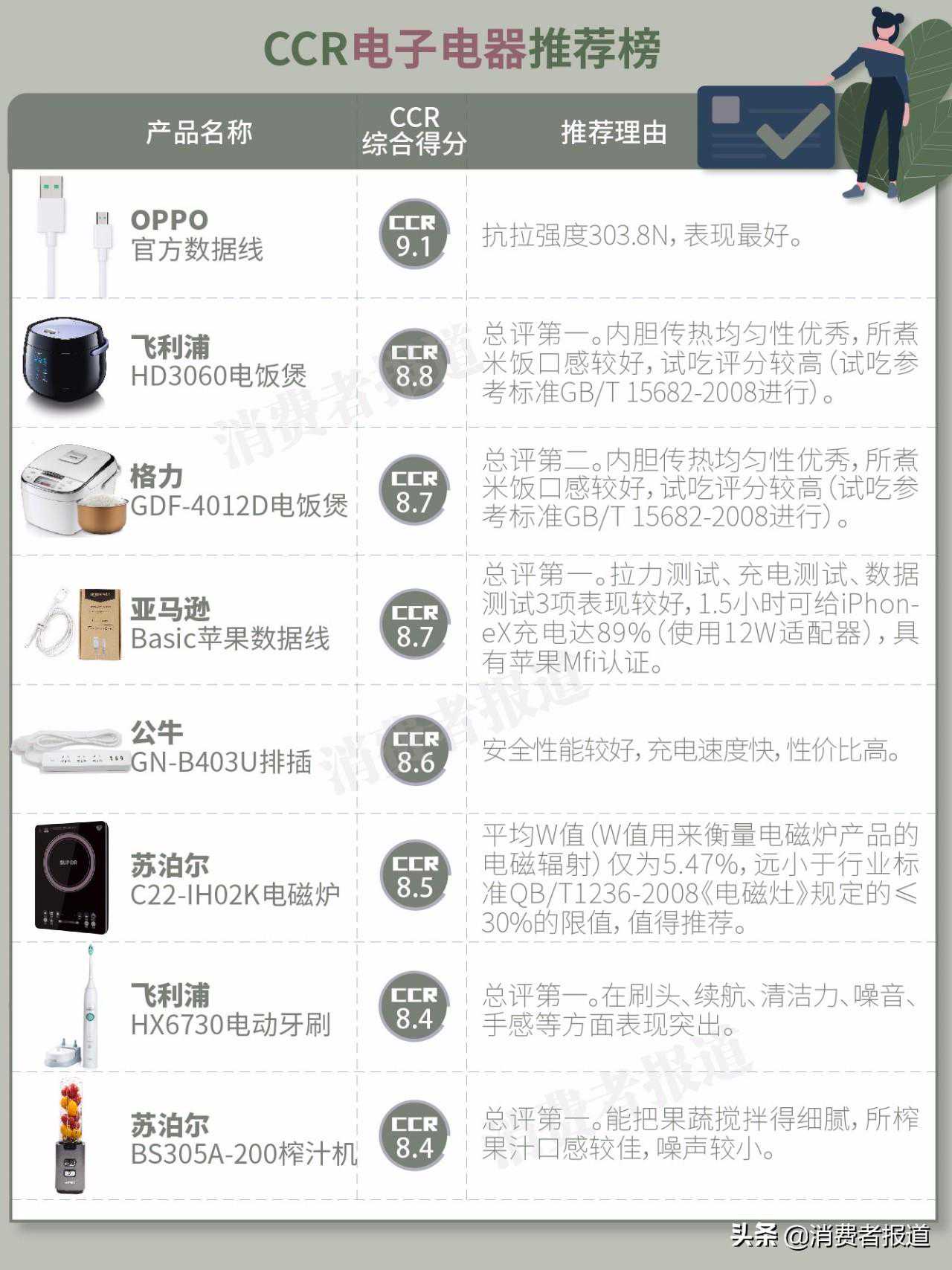 CCR推荐产品方面,本刊推荐OPPO官方数据线(安卓)、飞利浦HD3060电饭煲、格力GDF-4012D电饭煲、亚马逊Basic苹果数据线、公牛GN-B403U排插、苏泊尔C22-IH02K电磁炉、飞利浦HX6730电动牙刷、苏泊尔BS305A-200榨汁机等8款产品。