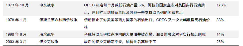 ►能源短缺:局部冲突往往与资源争夺有关,参与国对外经常扮演能源输出角色。上游原料价格上涨通过PPI产业链向下传导,最终导致CPI上涨,投资产出下降。平均来看,油价每上升10%,中国、美国、欧洲产出分别下降0.2%、0.26%、0.12%左右,其CPI分别上涨0.15%、0.28%、0.32%左右(图表4)。全球原油市场是一个供给高度集中的市场,数次石油危机都与中东地区的局部冲突有关(图表5)。1973年的石油危机作为典型的案例,引爆了美国的滞胀问题。1973年,主要石油输出国因战争和政治问题逐步压制美国经济。主要石油生产国宣布中断向美国出口石油,国际油价大幅上涨,美元作为国际结算货币大幅贬值。石油供应的减少也导致美国生产部分停滞,由此加剧了高通胀和低产出的滞胀局面,美国1973年GDP还有5.6%,而1974年快速下滑至-0.5%,CPI则高达11%。