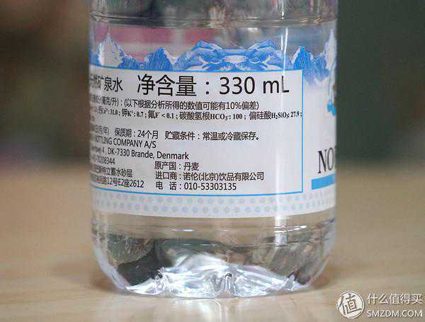 玻璃瓶身,上面有红色塑料膜包覆,很结实,但是这样的做工就感觉没巴黎水那么有质感,瓶身线条还算比较优雅美观,此款的进口商是达能依云(旗下有很多国家的很多矿泉水品牌)。