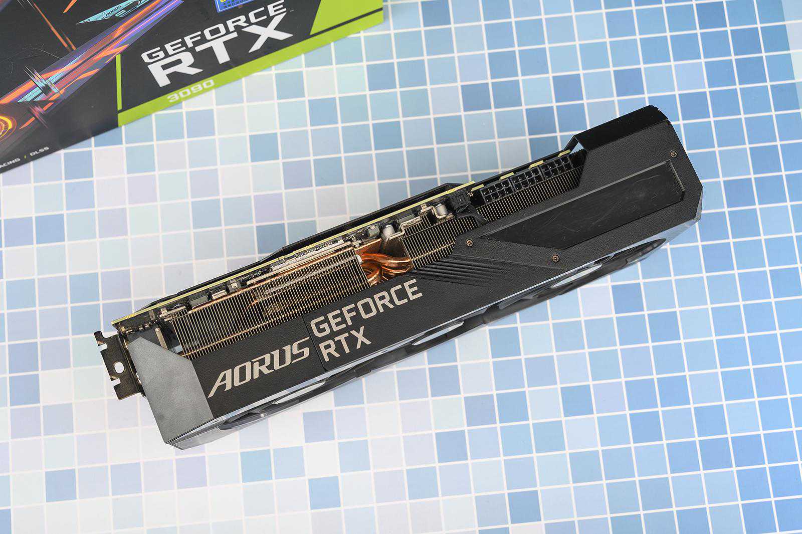 AORUSGeForceRTX3080XTREME大雕显卡配置有金属背板,不仅可以在视觉上营造高端大气上档次的感觉,而且还起到加固显卡PCB以及辅助散热的效果,这在高端显卡上已经是标准配置。同时金属背板并非是传统的平板式设计,而是在尾端打开了一个窗户,这个设计并非单纯为了视觉美观,此处的开窗可以使的最右侧风扇的风流直接贯穿散热器,让热量尽可能地散发到机箱内部并被机箱风扇带走,因此这样的设计同样是有利于加强显卡的散热。