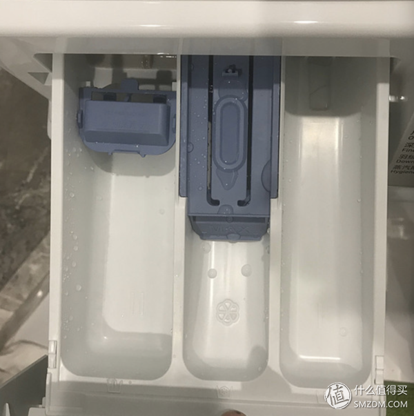 洗涤剂抽屉,采用改良的传统布局,增加了柔顺剂添加槽的面积,缩小了不常用的预洗槽。