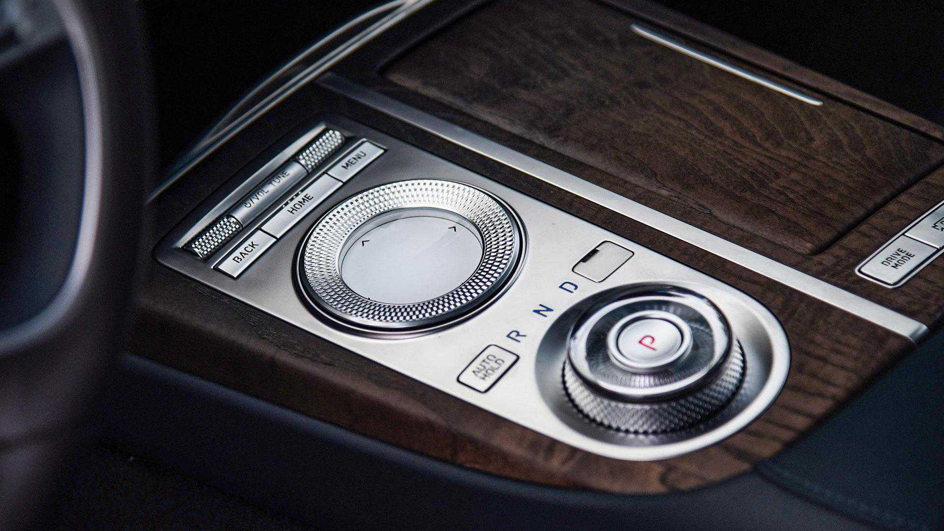 其中,挡把区域的双圆环设计非常精致,哑光银色的金属质感极强,搭配蓝色皮质和棕色实木面板,对得起其豪华中大型轿车的身份。