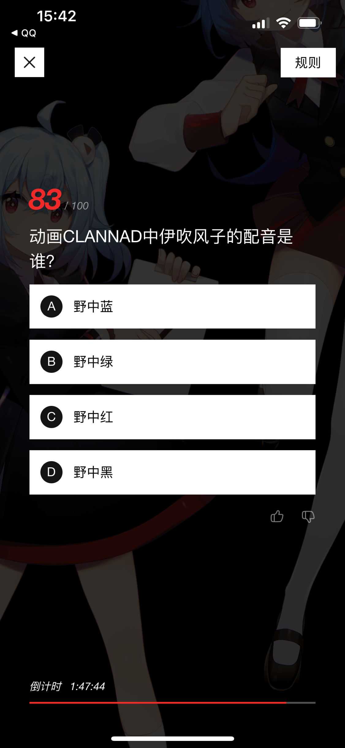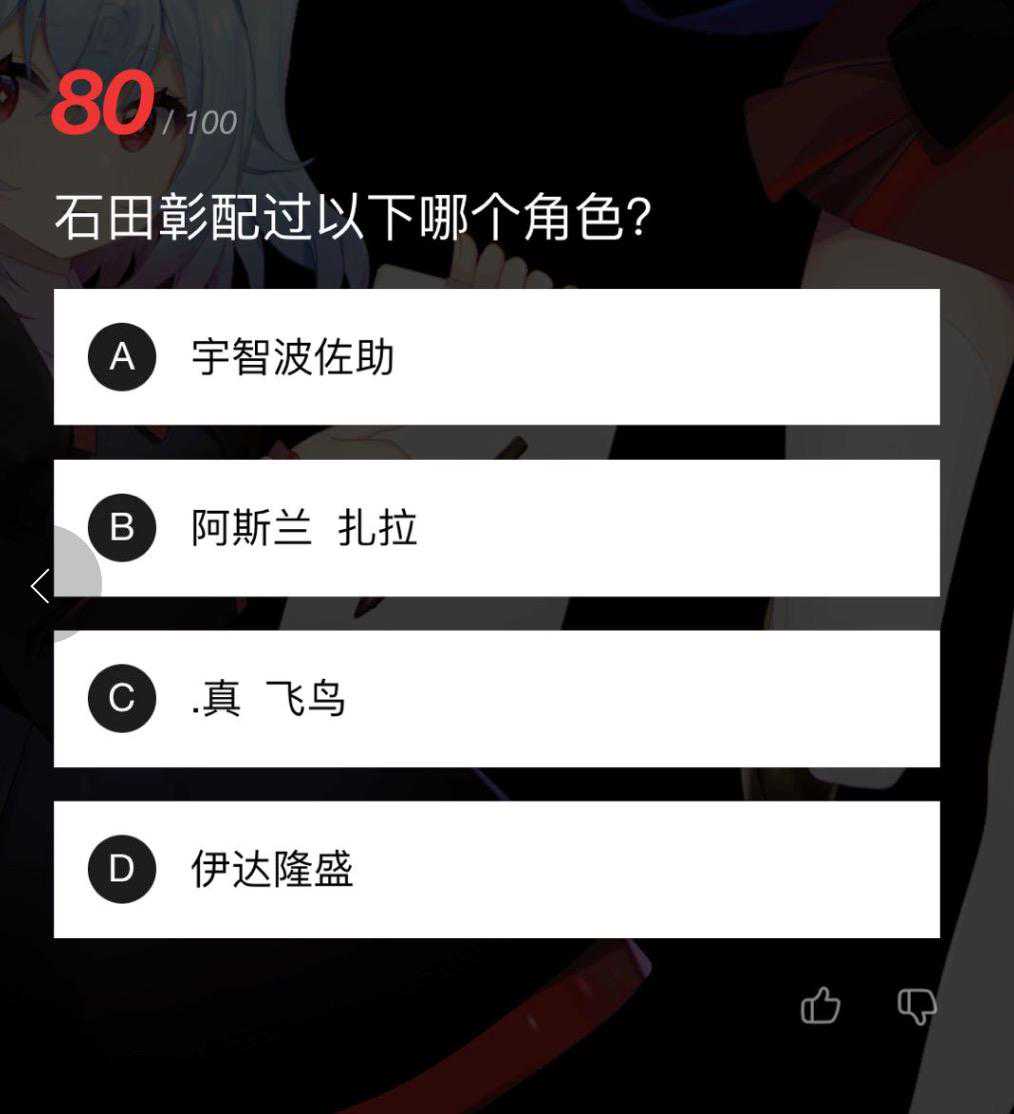 一些题目也是非常搞笑,对于熟悉的朋友来说,应该就是“送分题”,不过总体来说,题目的类型还是不是特别均衡,就动画来说,印象中声优题非常多,作画题大概2%,动画公司、流程类也比较多,问的问题大都很基础……我完全不看国漫,因此国漫相关大概10题左右都是全蒙的,当然国漫声优的问题也是不太清楚的,所以还丢了一些分,偶像动画我不太接触,也丢了一些分,因此我还是有相当的盲点的……但绝大多数问题难度都不大,即便不知道也可以用排除法得到结果。