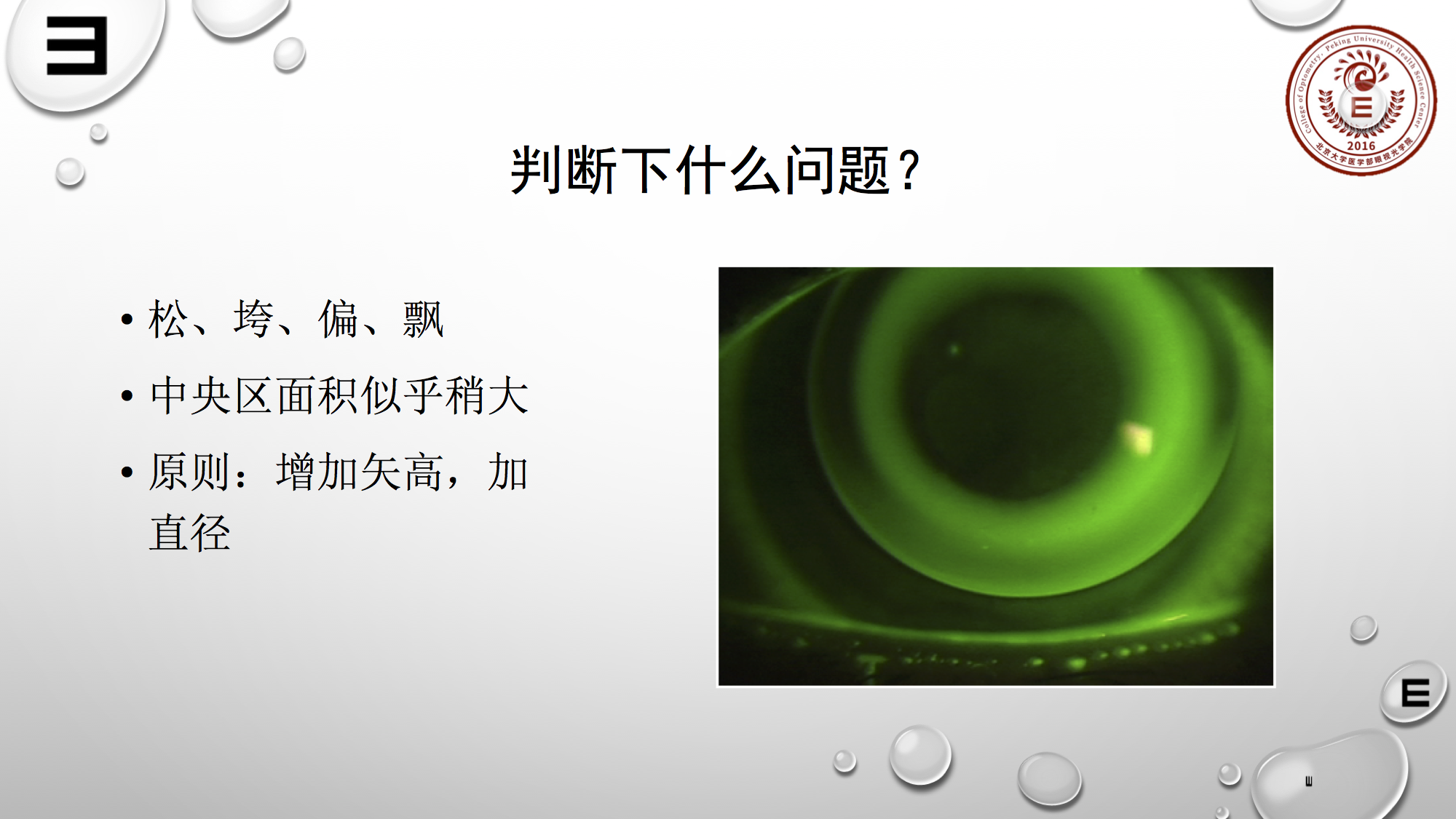 角膜中央区的点染有两个主要原因,一是蛋白沉积,若排除此原因,要写明它的矢高不足。在试戴过程中,若患者就出现角膜中央点染,你又看到一个不错的荧光染色配适,这时一定要警惕他是否存在矢高不足的可能性。