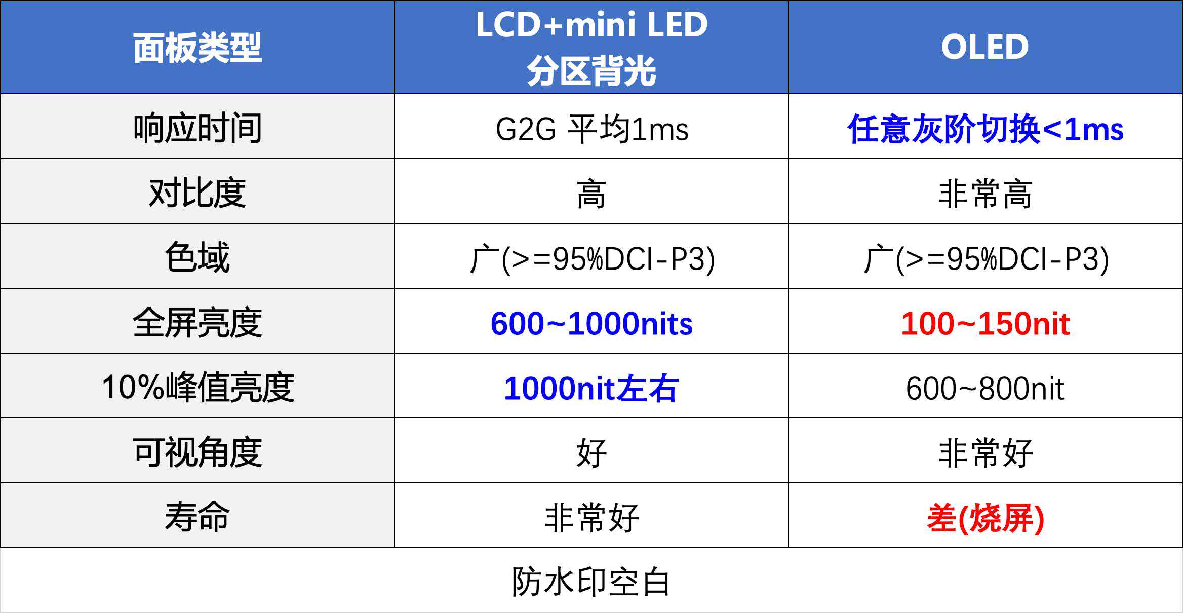 作为目前高端显示器唯二的方案,LCD+miniLED背光+分区背光和OLED屏幕相比,色域方面目前几乎已经打成平手。在主要参数上二者各有优劣,比如全屏亮度方面,OLED由于面板材质限制,目前的产品全屏最高亮度也只能达到100~150nit左右,而峰值亮度也仅能达到600nit左右。miniLED+分区背光产品,全屏亮度一般可以轻松超过600nits,最高可以实现1000nits的全屏亮度,峰值亮度也可以到达1000nits(三星的玄龙骑士峰值宣称2000nits)。不过在响应时间上,即使是高压快速响应液晶搭配OD(过驱动算法),物理上的限制还是让平均G2G仅能达到1ms左右(实际厂家标注还会刻意忽略Overshot,真实响应时间其实会比标称值略大),而顶级OLED屏幕已经可以实现最快1ms的任意灰阶响应。