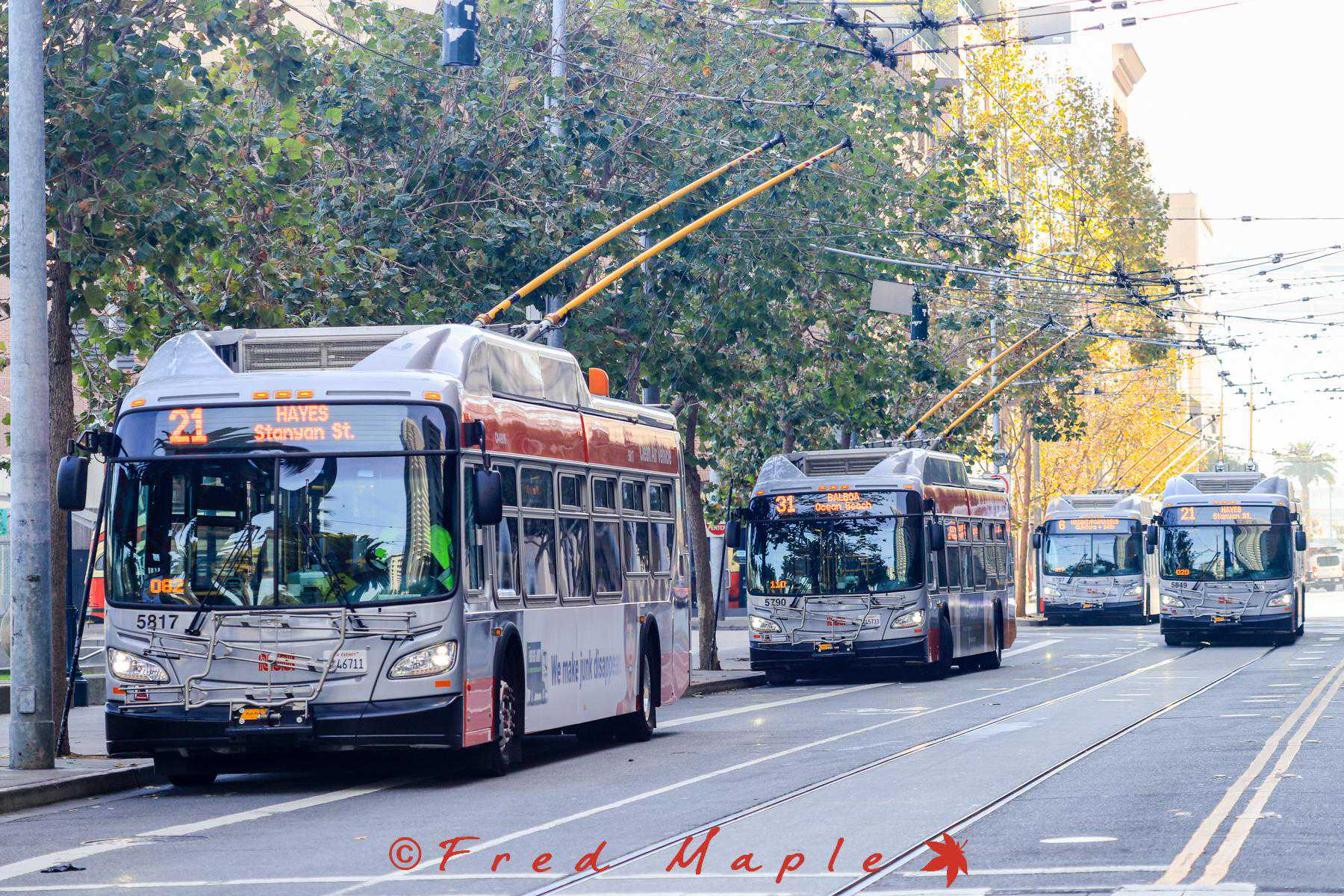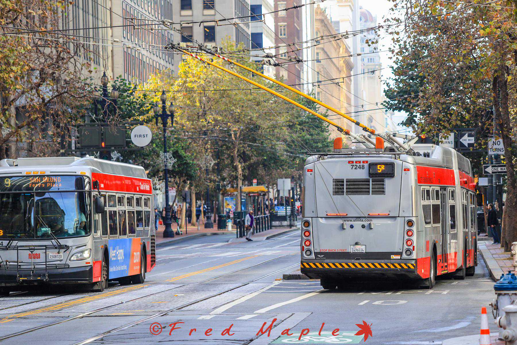 无轨电车线路包括1/2/3/5/5R/6/14/21/22/24/30/31/33/41/45/49,其中30/33/49目前使用汽车代运。再说句题外话,MUNI的线路号编排很有水平,将线路很明确的划分为Local/Rapid/Express三个层级,Local即为普通站站停靠的线路,Rapid(R)是大站快车,在旧金山是简配版BRT,Express(X)是有直达性质的快线,站点和客流均呈哑铃型,中间跨站的区域多使用快速路。而国内目前大部分的快线是不分Rapid和Express的,BRT开的像Local