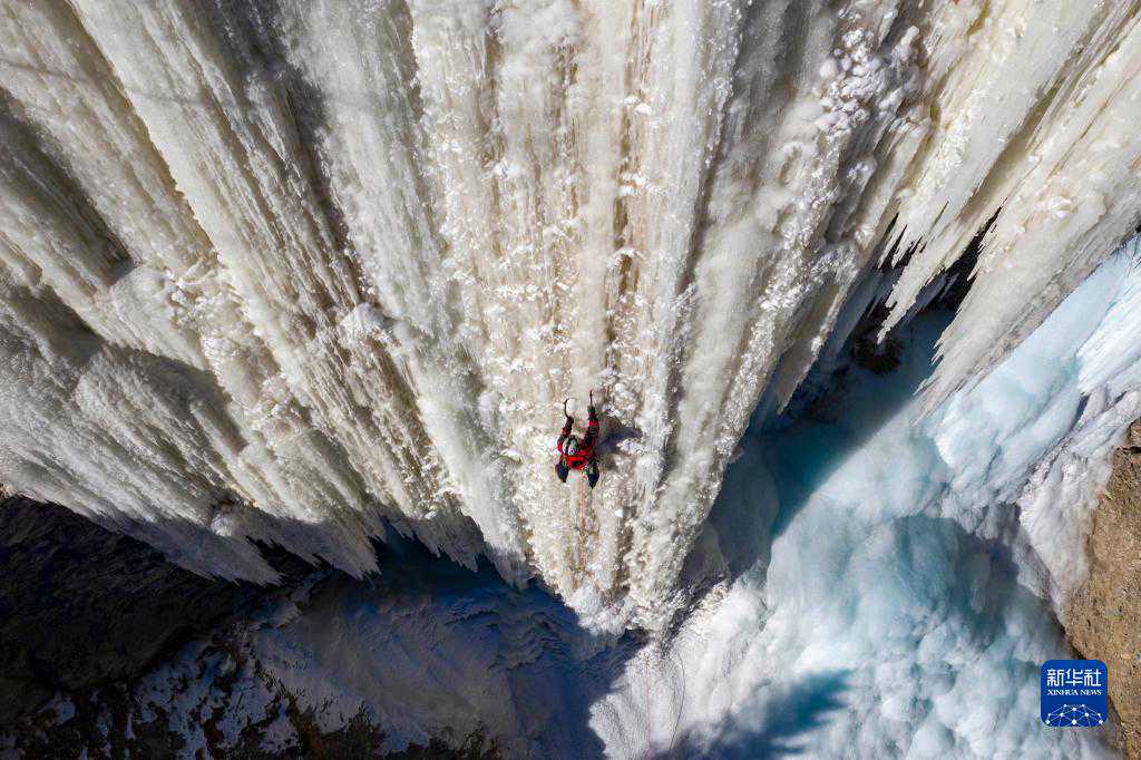 2021年1月16日,57岁的攀冰爱好者黄煌在新疆乌鲁木齐南郊一处峡谷中的冰壁上攀登。