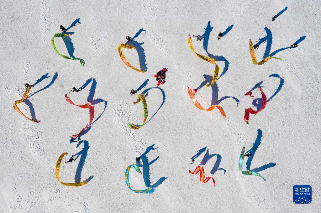 2021年3月6日,健身爱好者在黑龙江省鹤岗市新一体育公园内舞彩带龙。