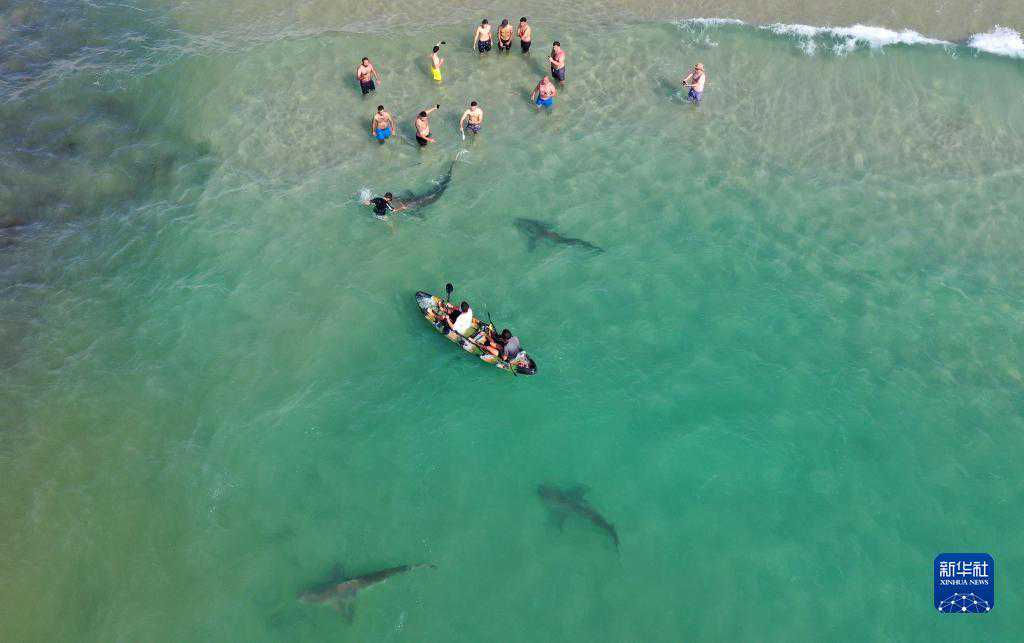 2021年4月20日,在以色列北部城市哈代拉的海边,鲨鱼从人们身边游过。