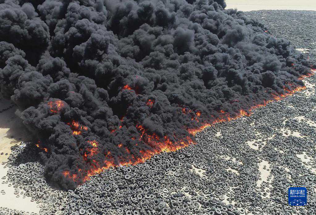 这是2021年4月29日在科威特杰赫拉省一处废弃轮胎存放处拍摄的火灾现场。