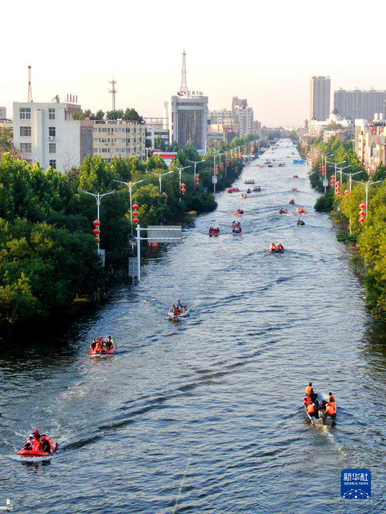 这是2021年7月26日在河南省卫辉市拍摄的救援现场。受连日强降雨影响,卫辉市新乡医学院第一附属医院被洪水围困,救援人员、医护人员、志愿者与时间赛跑,全力解救被困病患。