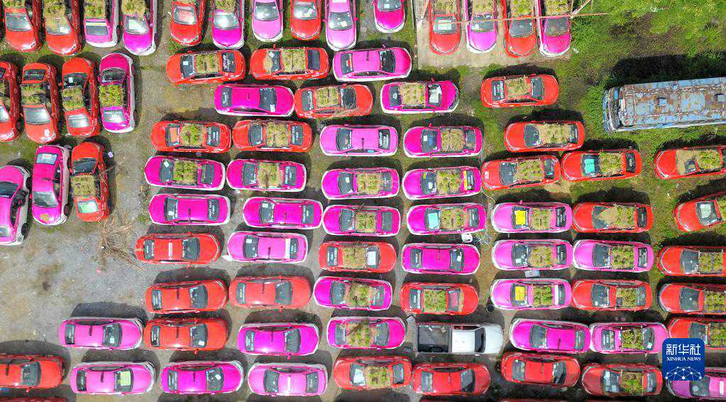 这是2021年9月24日在泰国首都曼谷一个停车场拍摄的出租车“菜园”。上百辆出租车因新冠疫情停运超过一年,出租车公司工作人员在车顶和引擎盖上堆土种菜,分发给员工和失业司机。