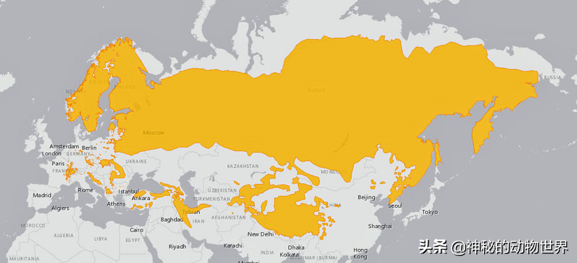 欧亚猞猁:分布在欧洲北部、中部和东部、中亚和西伯利亚、青藏高原和喜马拉雅山脉。