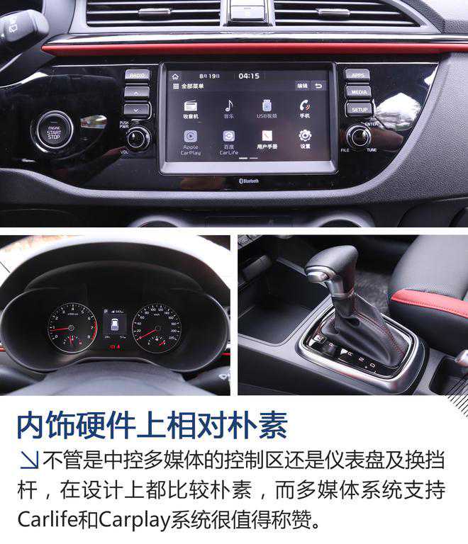在车内,我们经常能触及到的硬件基本上都比较朴素,不管是经典的双圆仪表盘,还是常见的中控控制区域,都主要以实用为主。在7英寸的中控显示屏上,集成了一些比较常见的功能,值得肯定的是多媒体系统能够支持百度Carlife以及苹果的Carplay,这在同级别车上并不多见。