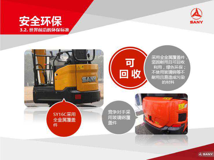 SY16C挖掘机不仅心灵手巧,用才环保可回收,不会对环境造成污染。SY16C采用全金属覆盖件,坚固耐用且可回收,绿色环保;不使用玻璃钢等,不耐用且易造成污染的材料。