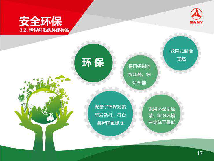 安全环保,花园式制造现场、采用铝制的散热器、油冷却器、配备了环保对策型发动机,符合最新国III标准、采用环保型油漆、将对环境污染降至最低。