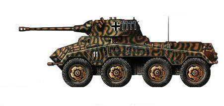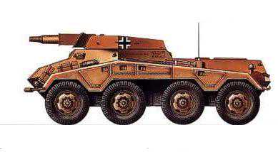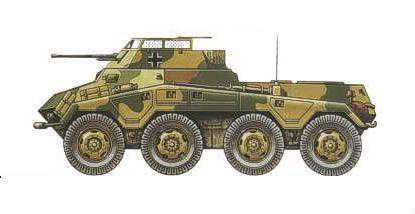 在经历了短暂的胜利后,德军在最后两年经历了惨烈的大撤退,尤其是在苏联。这些装甲车也开始不仅为装甲师所用,掷弹兵团,党卫军也开始指挥它们投入战斗。在这样的环境下,这些战场轻骑兵的任务不再单单是提供侦察情报并尽量不接触敌人了,火力成为了生存的关键因素。于是装到这些八轮装甲车上的更厚的装甲和火力更强的武器随后被证明十分有效。
