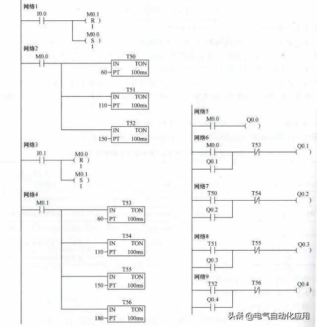 当按下起动按钮后,电磁阀YV打开,开始落料,同时一级传送带电动机M1起动,将物料往前传送,6s后二级传送带电动机M2起动,M2起动5s后三极传送带电动机M3起动,M3起动后4s后四级传送带电动机M4起动。