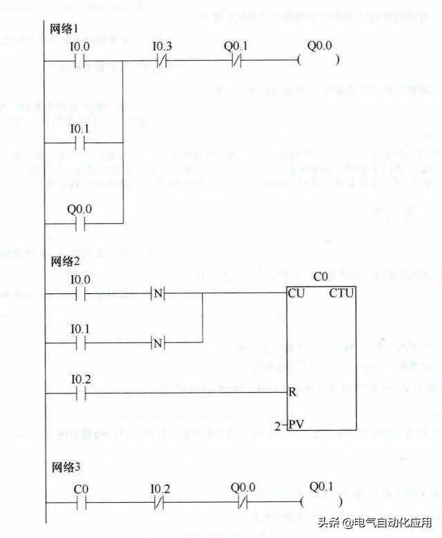 启动编程软件,编写满足控制要求的梯形图程序,编写完成的梯形图如下图所示。