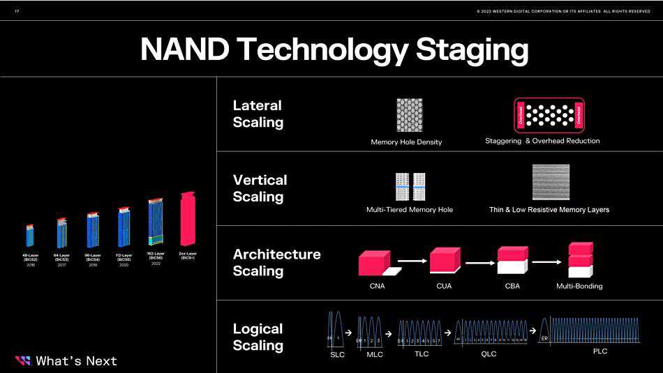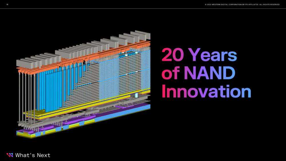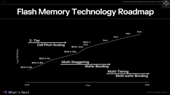 除此之外西数还公开了一些正在研发中的技术,比如通过粘合多个晶圆并使用其他先进技术制造具有500多层的3DNAND,通过路线图得知该技术有望在2032年到来。
