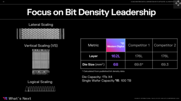 BiCS6将带来更快的I/O接口和更快的颗粒带宽,而且其QLC版本拥有比TLC版本更小的芯片面积和更高的存储密度,而且虽然西数的BiCS6QLC颗粒的堆叠层数比美光和SK海力士的176层QLC闪存要低一些,但存储密度却超越了它们。