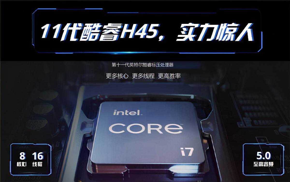 11代酷睿高性能移动版处理器H45采用了最新的10nmSuperFin增强版工艺制造,集成WillowCoveCPU架构,多达8核心16线程,单核、双核都可以加速跑到5.0GHz的惊人频率,玩游戏的时候火力全开,多核心、高频率双管齐下,游戏帧率拉满,不再有游戏卡顿等问题,丝滑流畅。