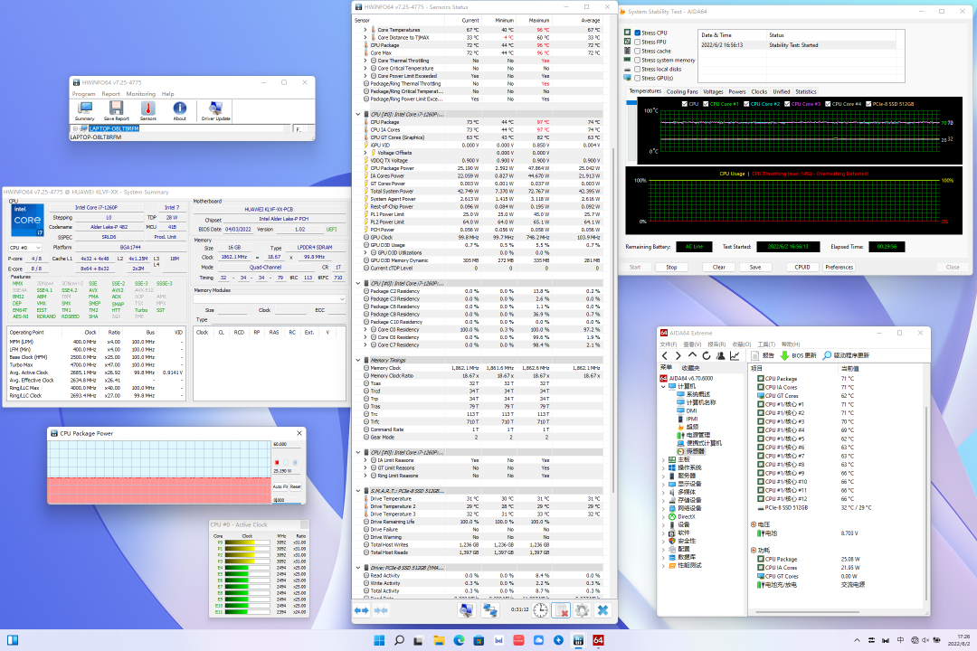 按FN+P键开启高能模式,在满载状态下,CPU温度最高97℃,稳定在73℃,功耗25W,P核频率维持在3.1GHz,E核频率维持在2.3~2.4GHz左右。