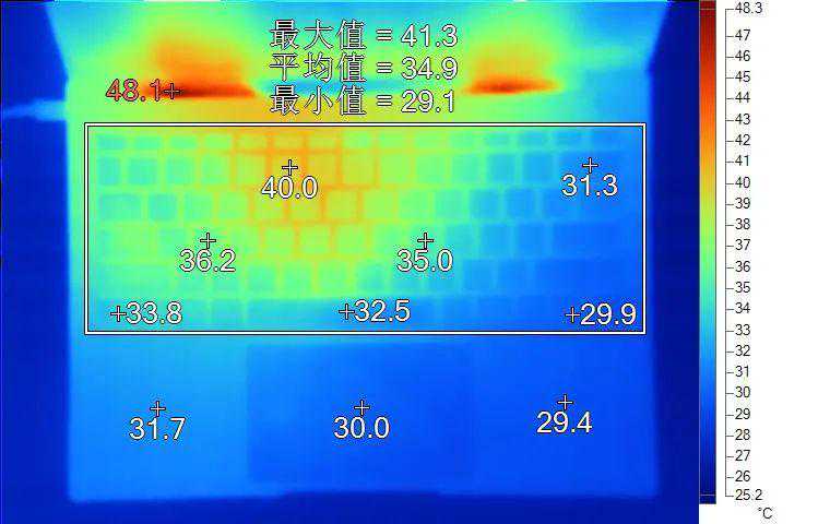 表面温度如上图所示,键盘键帽最高40℃出现在键盘数字5键周围,WASD键为36.2℃,方向键29.9℃。左腕托温度为31.7℃,背面中心点34.8℃。