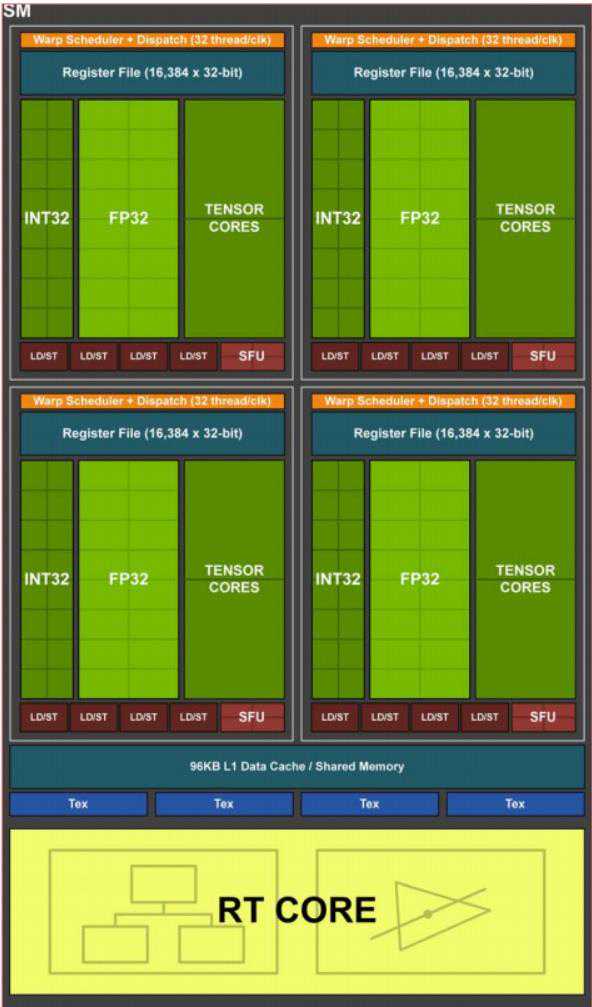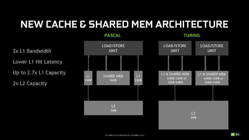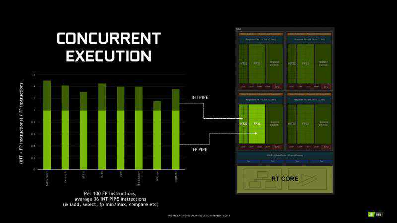 帕斯卡架构每个SM阵列集成128个FP32浮点单元,图灵架构则改成了2个FP64双精度浮点单元、64个FP32单精度浮点单元、64个INT32整数单元、8个Tensor核心、一个RT核心。支持浮点和整数并发操作,并有新的执行数据路径,类似伏特架构汇总的独立线程调度。