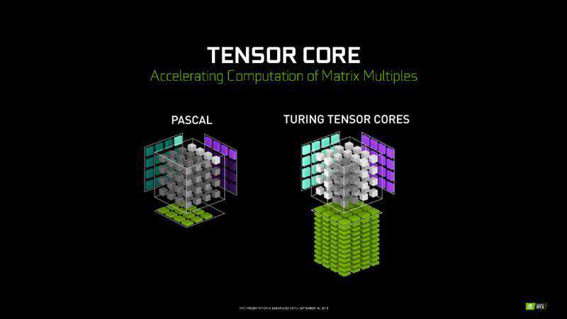 每个时钟周期内,图灵架构的Tensor核心可以执行64个FMA运算,从而大大加速矩阵运算,可用于新的神经实时图形渲染、深度学习训练和推理。