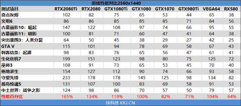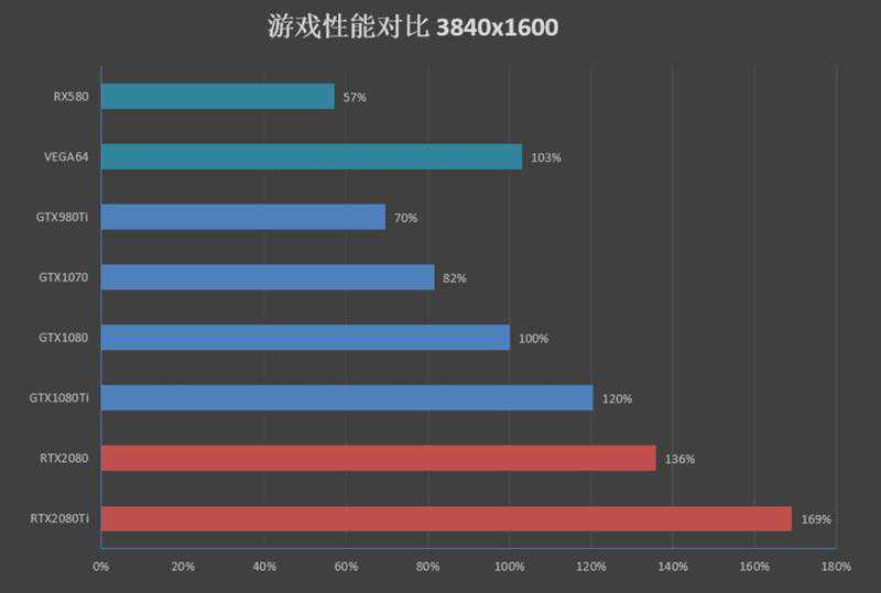 在4K分辨率下,RTX2080Ti的性能得以释放,相比GTX1080领先了69%,和GTX1080Ti相比,有41%的领先幅度。