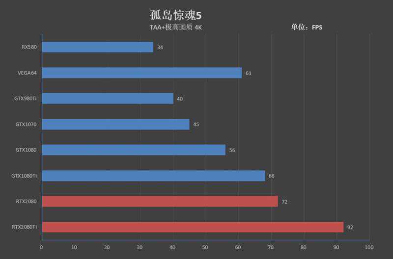 在《孤岛惊魂5》测试中,RTX2080Ti跑出了92FPS的帧率,领先GTX1080Ti24帧。