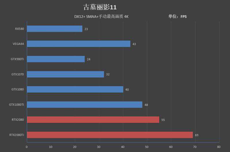 RTX2080Ti帧率为69FPS,领先GTX1080Ti21帧。