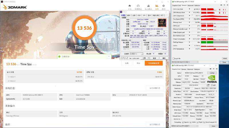 超频之后的RTX2080Ti3DMarkTimeSpy图形分数从默认的13661增加到了14763,增长了1100分,提升幅度8%。