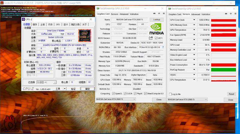 同样是5分钟的Furmark烤机测试,RTX2080Ti的温度则稳定在79度。