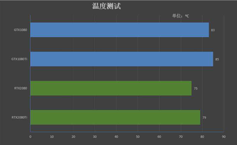图灵的公版显卡舍弃了原来的涡轮风扇改换成了现在的双风扇散热系统,温度也好看了很多。RTX2080烤机温度只有75度,比GTX1080低了8度,RTX2080Ti机温度为79度,比GTX1080Ti低了6度。