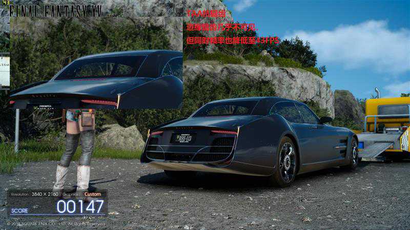 上图是开启了TAA抗锯齿的画面,汽车边缘的锯齿肉眼几乎不可见,但帧率也降低至43FPS。