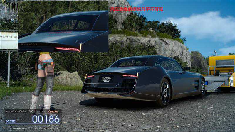 这是未开启抗锯齿的画质,帧数很高,达到了59FPS。但是汽车边缘的锯齿感非常明显,要知道这可是4K分辨率,如果降低到1080P,锯齿现象会更加严重。