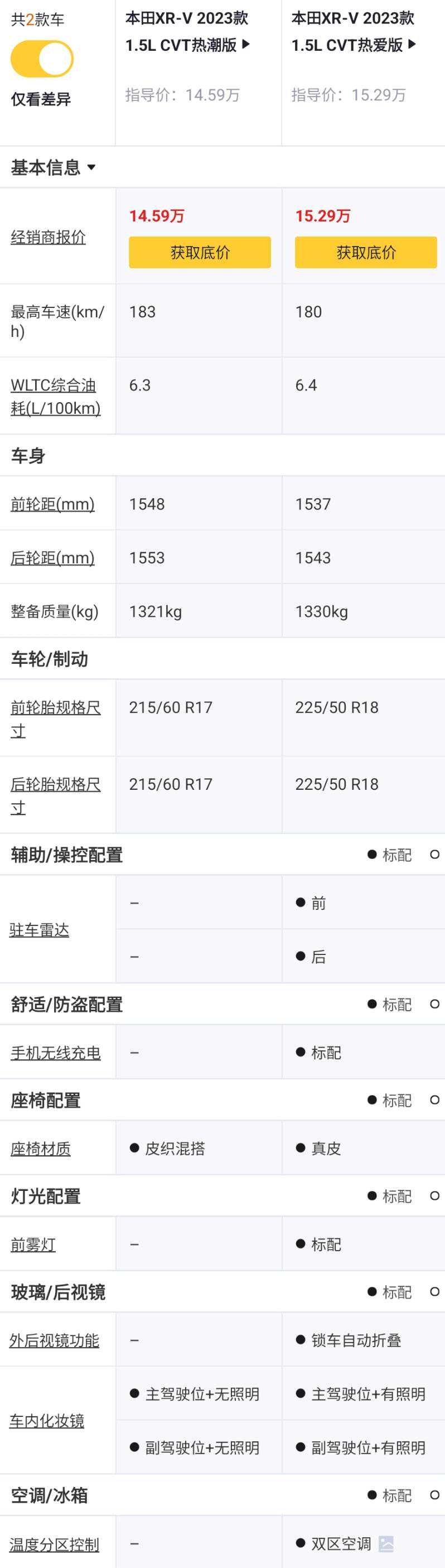 热爱版对比热潮版,价格+0.7万元,215/60R17轮胎升级为225/50R18,大轮胎观感更好,多了前倒车雷达和后倒车雷达,车内多了手机无线充电功能,织物/皮革双拼座椅升级为真皮座椅,多了前雾灯,外后视镜多了锁车自动折叠功能,车内化妆镜多了照明灯,自动单区空调升级为自动双区恒温空调。个人觉得,增加的配置能显著提高用车舒适性,这0.7万元花的值,建议升级。