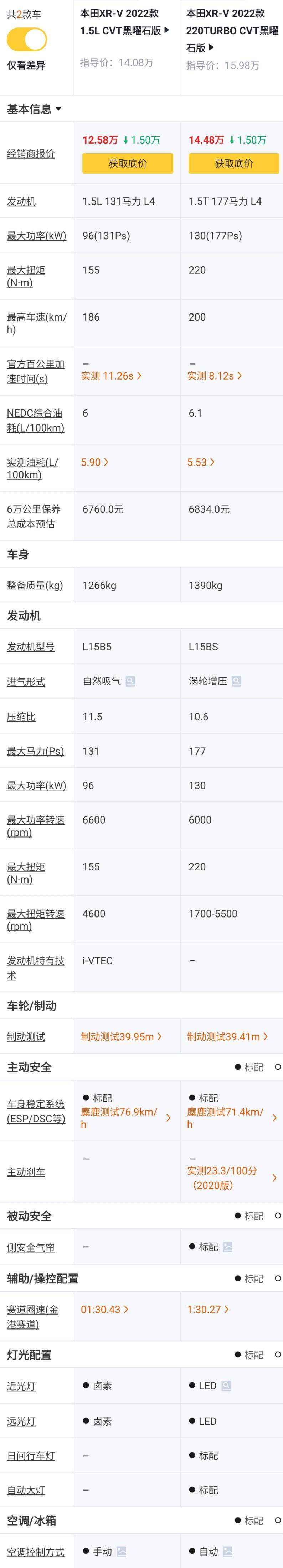 220TURBO黑曜石版对比1.5L黑曜石版,价格+1.9万元,1.5L自然吸气发动机升级到1.5T涡轮增压发动机,发动机马力从131Ps提高到177Ps,发动机功率从96kW提高到130kW,多了2个侧安全气帘,手动空调升级为自动空调,卤素大灯升级为LED大灯,多了LED日间行车灯和自动大灯。两者对比来说,虽然1.5T发动机动力表现更好,但本着实惠角度,1.9万元差价略贵,不建议升级。