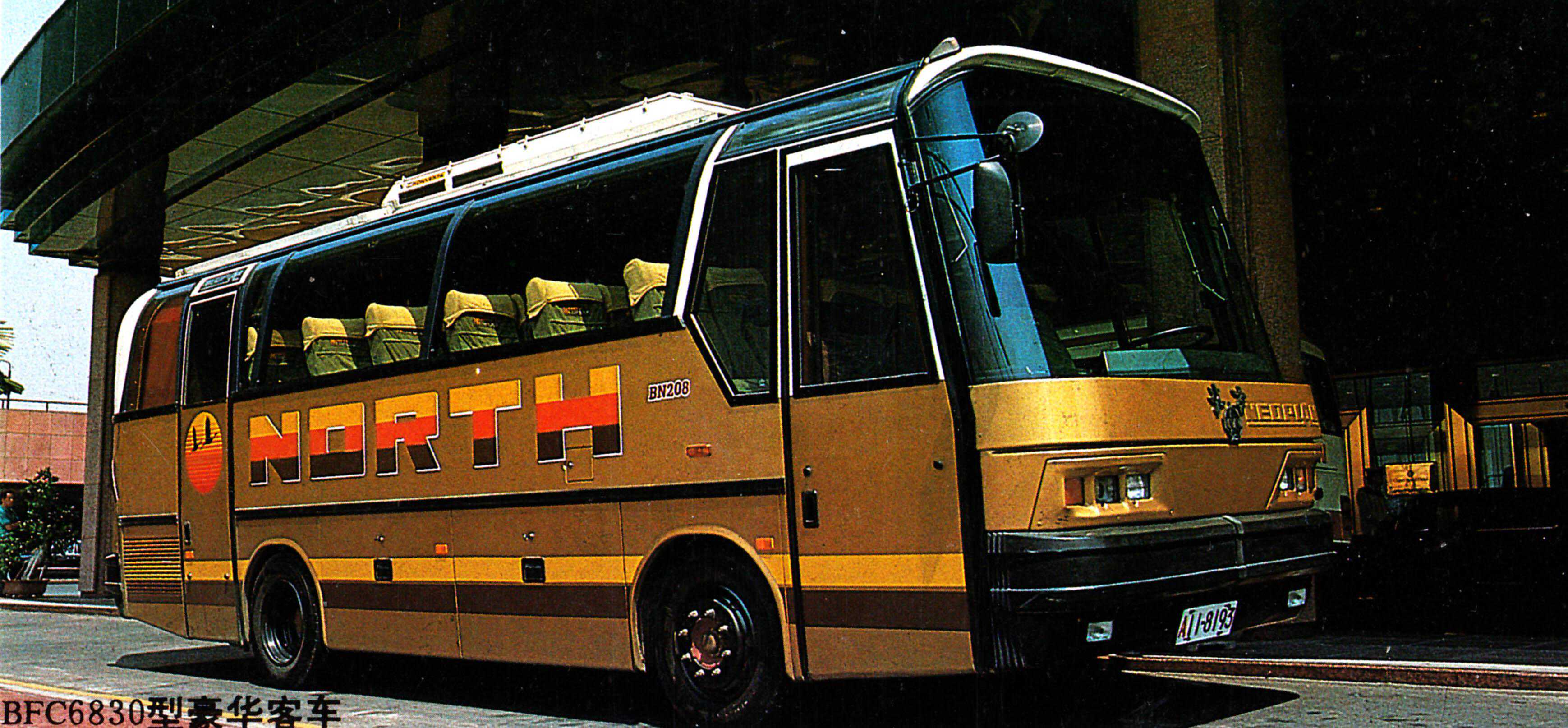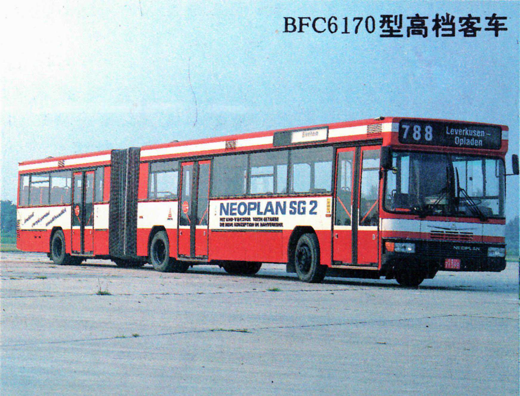 除此之外,北方客车也在上世纪90年代涉足城市公交领域,引进尼奥普兰公司生产许可证生产BFC6170型通道式公共汽车。该车采用低地板结构(仍为三级踏步,此处低地板为当年的宣传口径用语)、VOITH自动变速器及空气悬挂、无大梁全承载车架,同样装配F8L413F后置风冷发动机、独立悬挂前桥及ZF助力转向器。该型车因造价昂贵且不符合90年代国内公共交通实际使用需求,未获得量产。