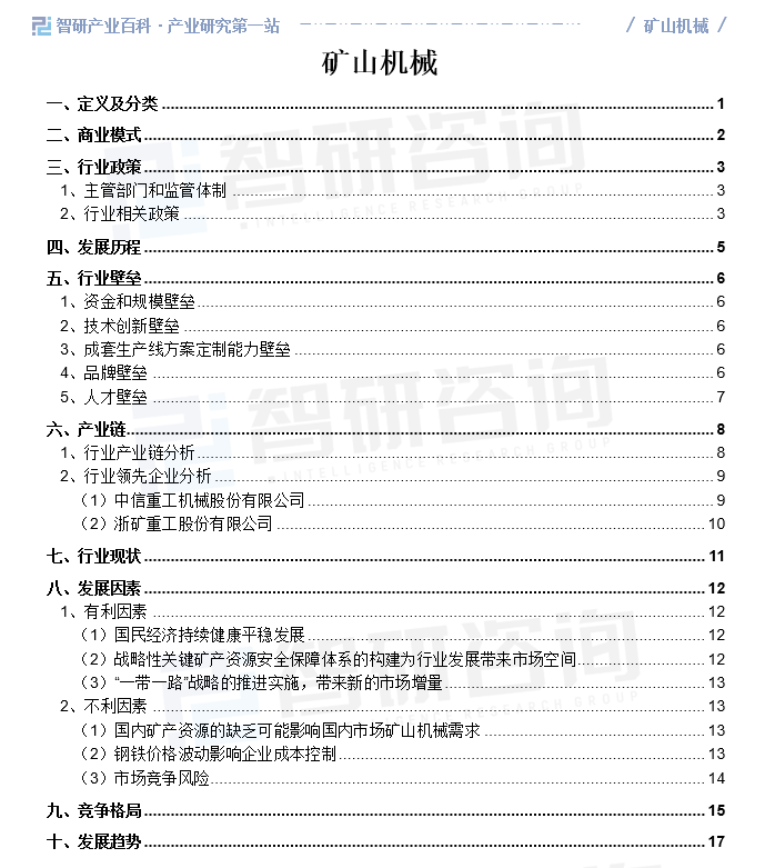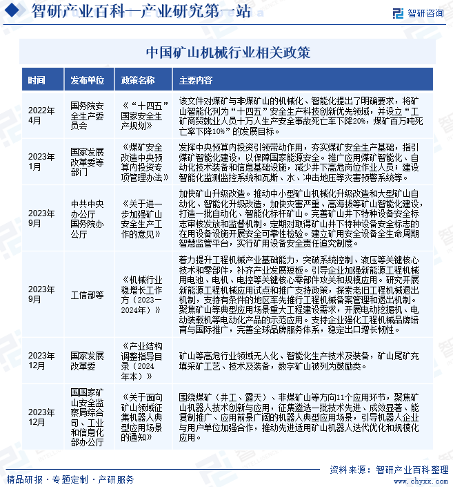 智研产业百科是智研咨询推出的产研工具平台,致力于为您提供全方位的百科式产业信息查询服务。智研咨询践行用信息驱动产业发展的企业使命,完善和丰富企业方法论,依托产业百科平台提升信息价值,持续为行业发展及企业投资决策赋能。矿山机械产业百科作为矿山机械产业一站式系统化研究工具,全面归纳了矿山机械产业知识信息,内容涵盖矿山机械产业的定义、分类、政策、产业链、竞争格局、发展趋势等,并依靠信息技术建立智能互链的行业知识图谱,为行研从业者及相关投资者提供深入的洞察力和全面的信息。